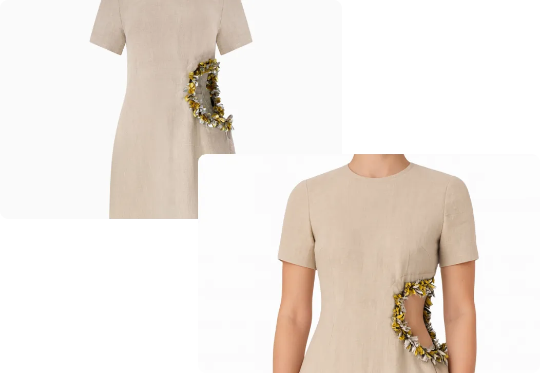 Each item is steamed, styled, and photographed using custom-designed hangers and a flexible mannequin that mimics the human form. Then, using cutting-edge AI tools, we digitally replace the mannequin with a realistic virtual model that aligns with your brand’s look.